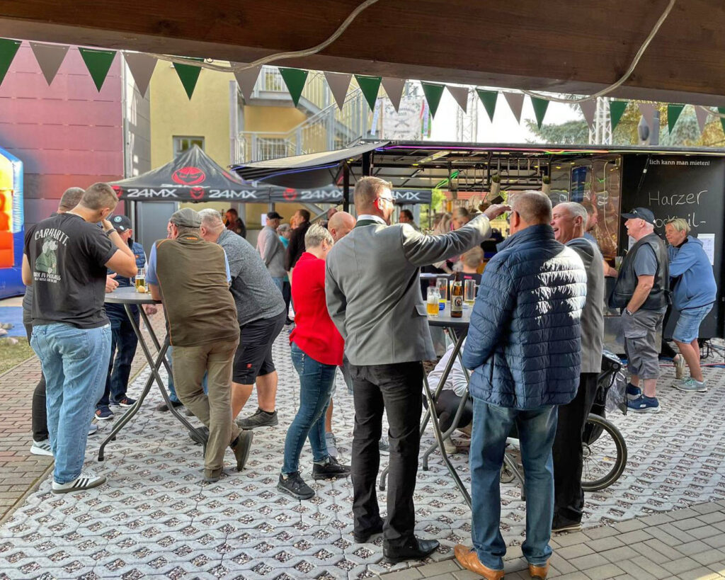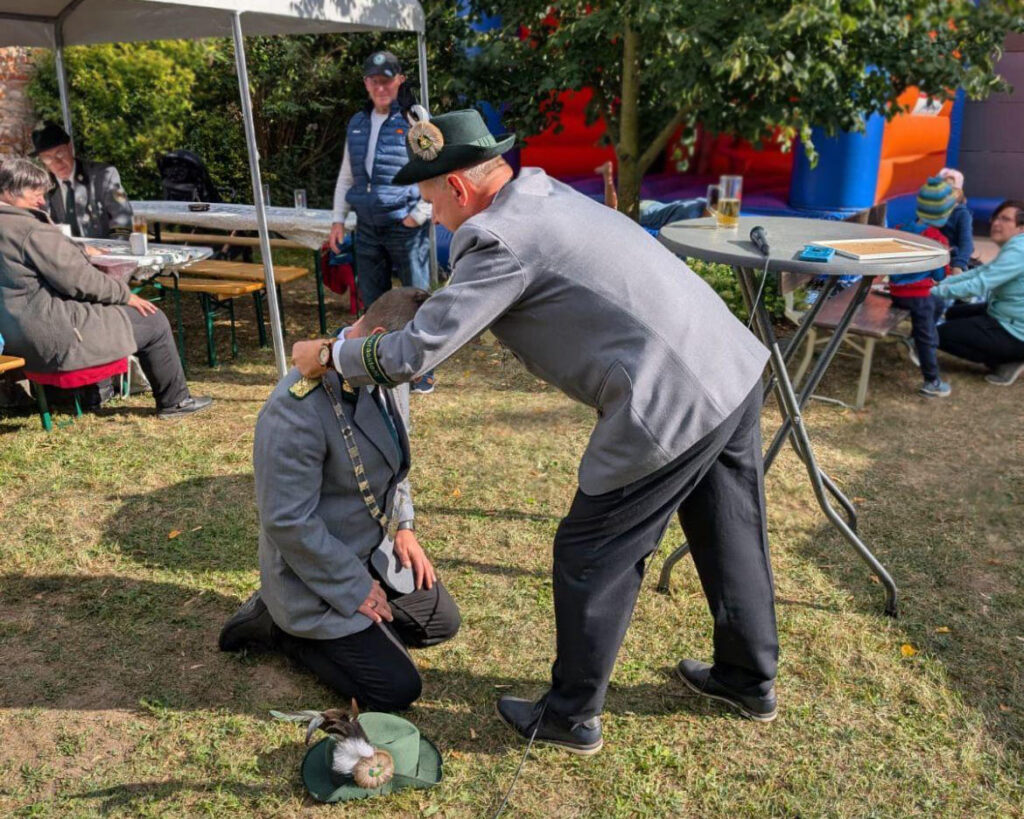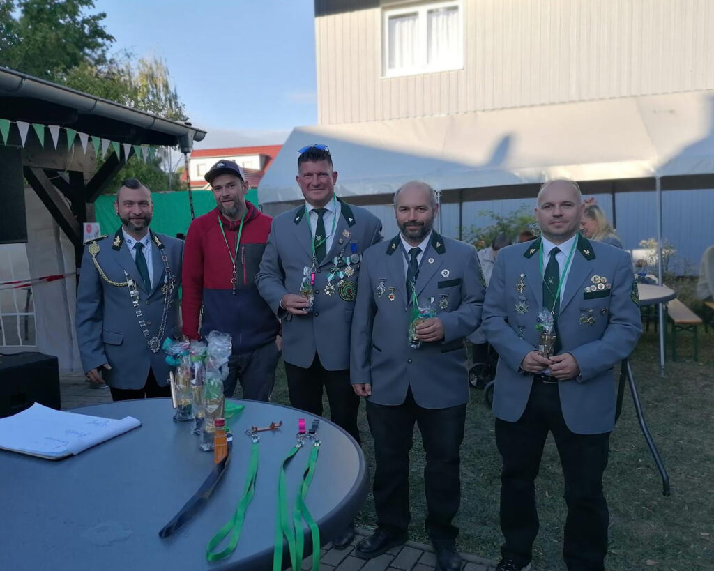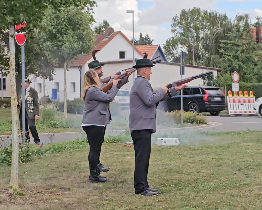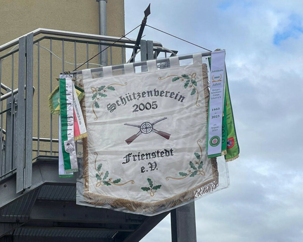 Vereinswappen vom - bestehend aus zwei gekreuzten Gewehren. Dahinter einer Zielscheibe und an beiden Seiten geschwungene Zweige einer Eiche. Darüber und darunter ist Schützenverein Frienstedt 2005 e.V. in gebrochener (alter) Schrift.